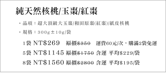 部落客大推: 平均每袋最低只要195元起(2袋免運)即可享有純天然核桃/玉棗/紅棗任選1袋/5袋/8袋(300g±10g/袋),可選:超大頂級大玉棗/和田原棗(紅棗)/紙皮核桃。