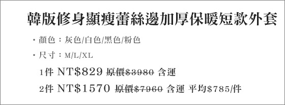 部落客大推: 平均每件最低只要785元起(含運)即可享有韓版修身顯瘦蕾絲邊加厚保暖短款外套1件/2件,顏色:灰色/白色/黑色/粉色,尺寸:M/L/XL。