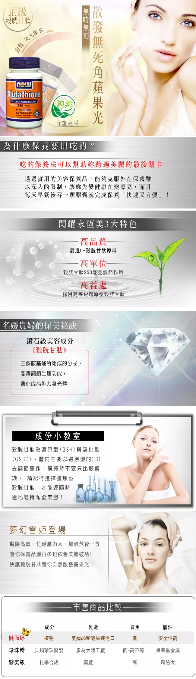還原態的GSH(全名:Glutathione,穀胱甘?),是由半胱胺酸L-cysteine、L-glutamate、L-glycine三種胺基酸自然合成的三胜?,調節體內許多生理功能,擁有強力青春美麗與健康活力作用,近年來相當更受到醫美界愛用。
