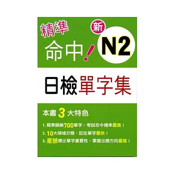 《精準命中!N2日檢單字集》並參考出題基準,精準預測出題方向。此外,有別於世面上一般的日檢單字書,本書是以領域來分類單字,分為「生活」、「學校」、「性格」、「運動」、「文化」、「自然科學」、「政治經濟」、「犯罪交通」、「擬音擬態語」、「片假名」,10類單字,相信此種分類能讓讀者體察單字的關連性,絕對有助於記憶。此外,本書將我們預測極有可能出現的單字用星號標出來,讓讀者在背誦時能多加留意。