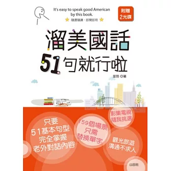 《溜美國話51句就行啦》採用「一蘿蔔一個坑」式學習法,把生活上最常遇到的情境,整理成數十個實用句型,內含基礎英文文法,配上符合情境的大量單字,您只需選擇自己需要的單字,代換進句型的單字空格中,就是一個完整的句子啦!